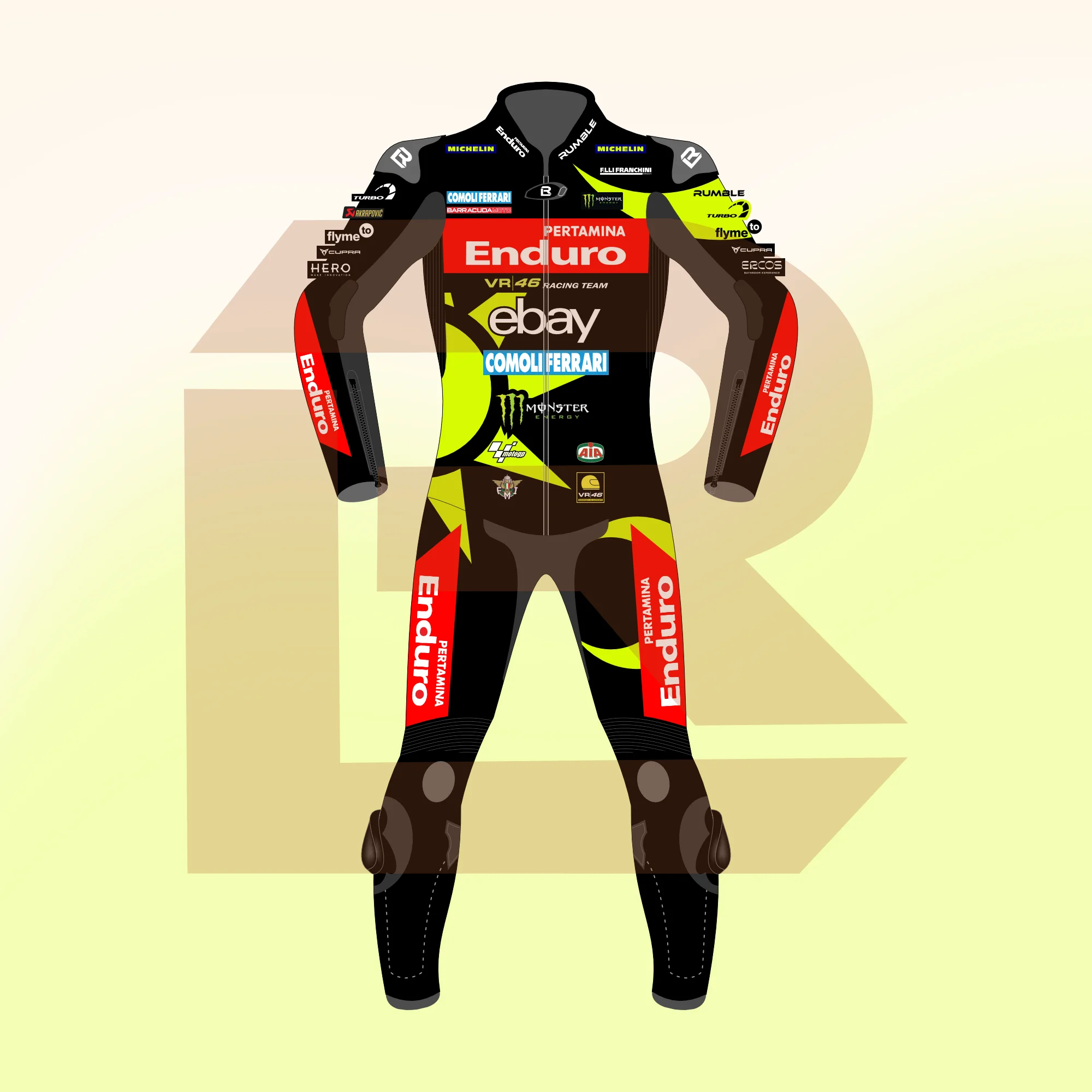 Push your limits with this premium leather suit inspired by Marco Bezzecchi and the Pertamina Enduro VR46 team from the 2024 MotoGP season. We build it using high-quality cowhide leather 1.2–1.3 mm for durability and solid protection on every ride. Stretch panels at key zones improve flexibility and give better control in motion. The suit features carbon-reinforced external sliders on knees and elbows for added safety in impact areas. Heavy-duty YKK zippers ensure smooth closure and a secure fit. Reinforced stitching increases strength and long-term performance. Inside, a soft polyester mesh lining helps airflow and keeps you cool during rides. CE-certified removable armour protects shoulders, elbows, knees, and hips. You can choose perforation options for better ventilation and select custom fit styles like slim, regular, or relax. This suit delivers a bold race look with comfort and reliable protection.